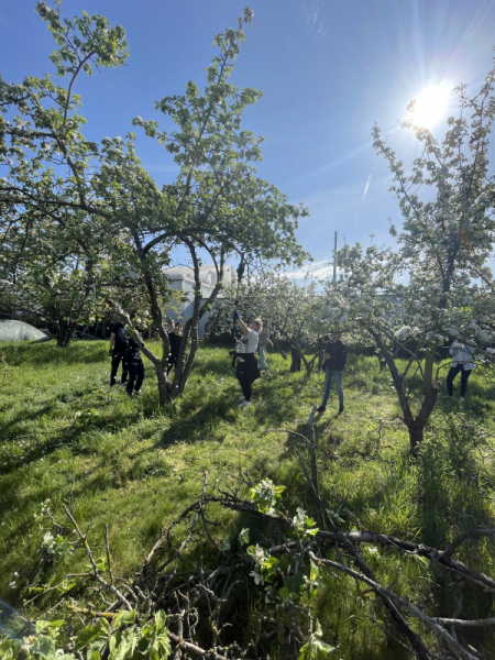 Die drei Birn- und Kirschbäume hatten sehr schön ausgetrieben. Antje erläuterte uns, dass die von Dendron zur Pflanzung gelieferten Bäume klimaresistente und sich selbst bestäubende Sorten sind. Danach erklärte sie die  Grundlagen des Obstbaumschnittes, demonstrierte auf humorvolle Art „die Macht der Gartenschere“ und animierte die Azubis fachgerecht selbst einmal zu schneiden. Die drei kleinen Bäume waren schnell geschnitten und danach ging es an die in voller Blüte stehenden, alten Apfel- und Pflaumenbäume. Mit Ast- und Gartenscheren, Baumsäge sowie zwei kleinen Kettensägen wurden die Bäume von toten Ästen befreit und fachgerecht gestutzt. Mit dem beräumten Totholz wurde eine Bentjeshecke geformt. Ein Anfang war gemacht, und alle drei Projektpartner sind sich einig, im Herbst mit der Pflanzung weiterer Obstbäume an diesen erfolgreichen Projekttag anzuschließen.