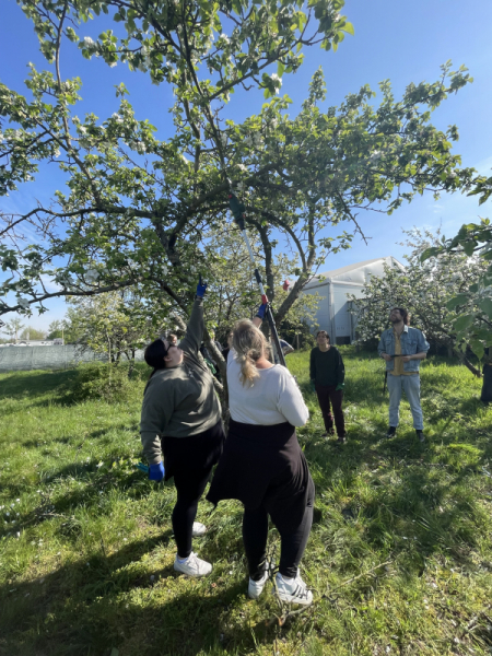 Die drei Birn- und Kirschbäume hatten sehr schön ausgetrieben. Antje erläuterte uns, dass die von Dendron zur Pflanzung gelieferten Bäume klimaresistente und sich selbst bestäubende Sorten sind. Danach erklärte sie die  Grundlagen des Obstbaumschnittes, demonstrierte auf humorvolle Art „die Macht der Gartenschere“ und animierte die Azubis fachgerecht selbst einmal zu schneiden. Die drei kleinen Bäume waren schnell geschnitten und danach ging es an die in voller Blüte stehenden, alten Apfel- und Pflaumenbäume. Mit Ast- und Gartenscheren, Baumsäge sowie zwei kleinen Kettensägen wurden die Bäume von toten Ästen befreit und fachgerecht gestutzt. Mit dem beräumten Totholz wurde eine Bentjeshecke geformt. Ein Anfang war gemacht, und alle drei Projektpartner sind sich einig, im Herbst mit der Pflanzung weiterer Obstbäume an diesen erfolgreichen Projekttag anzuschließen.