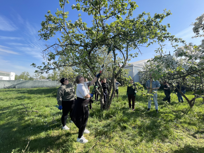 Die drei Birn- und Kirschbäume hatten sehr schön ausgetrieben. Antje erläuterte uns, dass die von Dendron zur Pflanzung gelieferten Bäume klimaresistente und sich selbst bestäubende Sorten sind. Danach erklärte sie die  Grundlagen des Obstbaumschnittes, demonstrierte auf humorvolle Art „die Macht der Gartenschere“ und animierte die Azubis fachgerecht selbst einmal zu schneiden. Die drei kleinen Bäume waren schnell geschnitten und danach ging es an die in voller Blüte stehenden, alten Apfel- und Pflaumenbäume. Mit Ast- und Gartenscheren, Baumsäge sowie zwei kleinen Kettensägen wurden die Bäume von toten Ästen befreit und fachgerecht gestutzt. Mit dem beräumten Totholz wurde eine Bentjeshecke geformt. Ein Anfang war gemacht, und alle drei Projektpartner sind sich einig, im Herbst mit der Pflanzung weiterer Obstbäume an diesen erfolgreichen Projekttag anzuschließen.