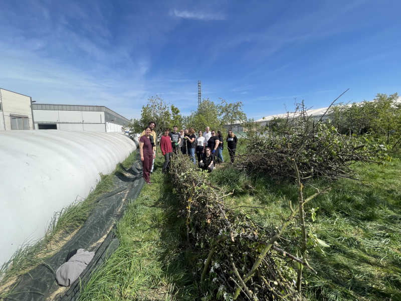 Die drei Birn- und Kirschbäume hatten sehr schön ausgetrieben. Antje erläuterte uns, dass die von Dendron zur Pflanzung gelieferten Bäume klimaresistente und sich selbst bestäubende Sorten sind. Danach erklärte sie die  Grundlagen des Obstbaumschnittes, demonstrierte auf humorvolle Art „die Macht der Gartenschere“ und animierte die Azubis fachgerecht selbst einmal zu schneiden. Die drei kleinen Bäume waren schnell geschnitten und danach ging es an die in voller Blüte stehenden, alten Apfel- und Pflaumenbäume. Mit Ast- und Gartenscheren, Baumsäge sowie zwei kleinen Kettensägen wurden die Bäume von toten Ästen befreit und fachgerecht gestutzt. Mit dem beräumten Totholz wurde eine Bentjeshecke geformt. Ein Anfang war gemacht, und alle drei Projektpartner sind sich einig, im Herbst mit der Pflanzung weiterer Obstbäume an diesen erfolgreichen Projekttag anzuschließen.