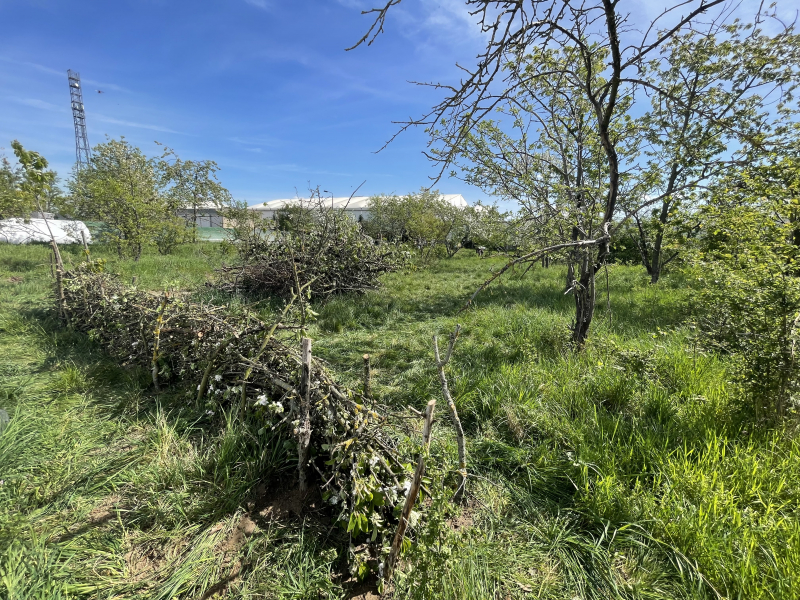 Die drei Birn- und Kirschbäume hatten sehr schön ausgetrieben. Antje erläuterte uns, dass die von Dendron zur Pflanzung gelieferten Bäume klimaresistente und sich selbst bestäubende Sorten sind. Danach erklärte sie die  Grundlagen des Obstbaumschnittes, demonstrierte auf humorvolle Art „die Macht der Gartenschere“ und animierte die Azubis fachgerecht selbst einmal zu schneiden. Die drei kleinen Bäume waren schnell geschnitten und danach ging es an die in voller Blüte stehenden, alten Apfel- und Pflaumenbäume. Mit Ast- und Gartenscheren, Baumsäge sowie zwei kleinen Kettensägen wurden die Bäume von toten Ästen befreit und fachgerecht gestutzt. Mit dem beräumten Totholz wurde eine Bentjeshecke geformt. Ein Anfang war gemacht, und alle drei Projektpartner sind sich einig, im Herbst mit der Pflanzung weiterer Obstbäume an diesen erfolgreichen Projekttag anzuschließen.