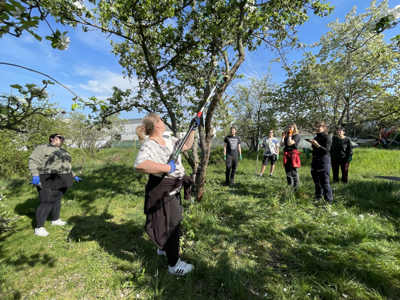 Die drei Birn- und Kirschbäume hatten sehr schön ausgetrieben. Antje erläuterte uns, dass die von Dendron zur Pflanzung gelieferten Bäume klimaresistente und sich selbst bestäubende Sorten sind. Danach erklärte sie die Grundlagen des Obstbaumschnittes, demonstrierte auf humorvolle Art „die Macht der Gartenschere“ und animierte die Azubis fachgerecht selbst einmal zu schneiden. Die drei kleinen Bäume waren schnell geschnitten und danach ging es an die in voller Blüte stehenden, alten Apfel- und Pflaumenbäume. Mit Ast- und Gartenscheren, Baumsäge sowie zwei kleinen Kettensägen wurden die Bäume von toten Ästen befreit und fachgerecht gestutzt. Mit dem beräumten Totholz wurde eine Bentjeshecke geformt. Ein Anfang war gemacht, und alle drei Projektpartner sind sich einig, im Herbst mit der Pflanzung weiterer Obstbäume an diesen erfolgreichen Projekttag anzuschließen.