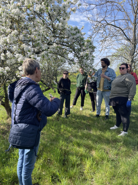 Die drei Birn- und Kirschbäume hatten sehr schön ausgetrieben. Antje erläuterte uns, dass die von Dendron zur Pflanzung gelieferten Bäume klimaresistente und sich selbst bestäubende Sorten sind. Danach erklärte sie die  Grundlagen des Obstbaumschnittes, demonstrierte auf humorvolle Art „die Macht der Gartenschere“ und animierte die Azubis fachgerecht selbst einmal zu schneiden. Die drei kleinen Bäume waren schnell geschnitten und danach ging es an die in voller Blüte stehenden, alten Apfel- und Pflaumenbäume. Mit Ast- und Gartenscheren, Baumsäge sowie zwei kleinen Kettensägen wurden die Bäume von toten Ästen befreit und fachgerecht gestutzt. Mit dem beräumten Totholz wurde eine Bentjeshecke geformt. Ein Anfang war gemacht, und alle drei Projektpartner sind sich einig, im Herbst mit der Pflanzung weiterer Obstbäume an diesen erfolgreichen Projekttag anzuschließen.