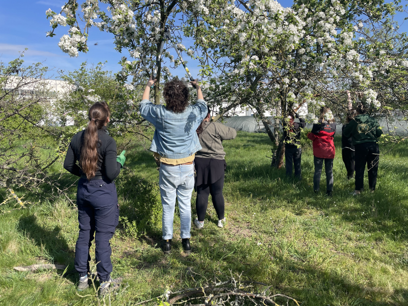 Die drei Birn- und Kirschbäume hatten sehr schön ausgetrieben. Antje erläuterte uns, dass die von Dendron zur Pflanzung gelieferten Bäume klimaresistente und sich selbst bestäubende Sorten sind. Danach erklärte sie die  Grundlagen des Obstbaumschnittes, demonstrierte auf humorvolle Art „die Macht der Gartenschere“ und animierte die Azubis fachgerecht selbst einmal zu schneiden. Die drei kleinen Bäume waren schnell geschnitten und danach ging es an die in voller Blüte stehenden, alten Apfel- und Pflaumenbäume. Mit Ast- und Gartenscheren, Baumsäge sowie zwei kleinen Kettensägen wurden die Bäume von toten Ästen befreit und fachgerecht gestutzt. Mit dem beräumten Totholz wurde eine Bentjeshecke geformt. Ein Anfang war gemacht, und alle drei Projektpartner sind sich einig, im Herbst mit der Pflanzung weiterer Obstbäume an diesen erfolgreichen Projekttag anzuschließen.